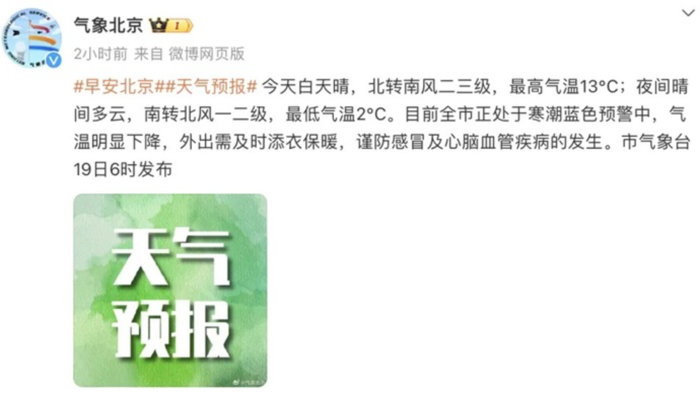 北京市气象台10月19日6时发布:今天白天晴,北转南风二三级,最高气温13℃;夜间晴间多云,南转北风一二级,最低气温2℃。目前全市正处于寒潮蓝色预警中,气温明显下降,外出需及时添衣保暖,谨防感冒及心脑血管疾病的发生。