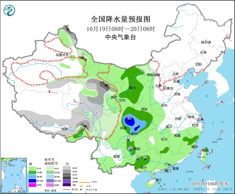 10月19日8时至20日8时,新疆西北部和北疆东部、西藏南部和东部、青海中东部、甘肃河西、川西高原等地部分地区有小到中雪或雨夹雪,其中,新疆西北部和北疆东部、青海北部、甘肃河西等地部分地区有大到暴雪(10~15毫米)。内蒙古西部、西北地区东部、四川盆地、贵州中西部、福建北部、广西中西部等地部分地区有中到大雨,其中,四川东部、重庆西部等地部分地区有暴雨(50~90毫米)。青海西部、山东南部、江苏北部、浙江北部等地部分地区有4~6级风,其中,西藏北部部分地区有7~8级风。