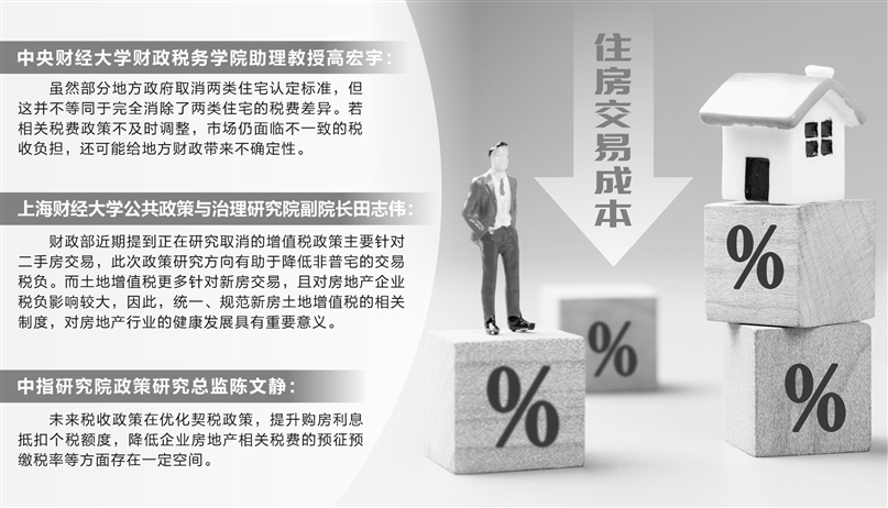 在受访专家学者看来,近期从多地及时取消或调整普宅和非普宅标准,到财政部透露正在抓紧研究明确与取消普宅和非普宅标准相衔接的增值税、土地增值税政策,都指向住房交易成本将进一步减轻,居民改善型住房需求将得到更好满足。往后看,针对房地产市场的税收优惠政策还有施策空间,居民购房成本、房企税费压力有望进一步降低。