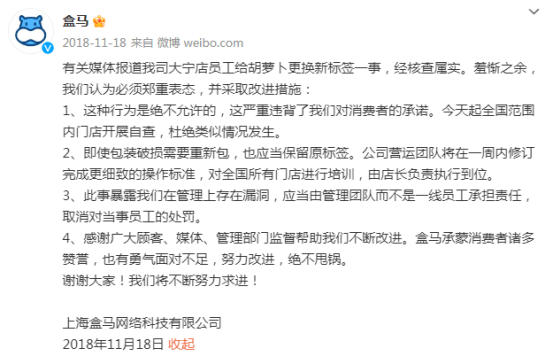 事件不断发酵后,盒马在官方微博承认错误,并承诺将在全国范围内门店开展自查,杜绝类似情况发生。