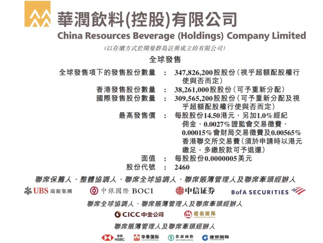 此次IPO,按发售价中位数14港元计(超额配股权未获行使),华润饮料预计募集资金总和约47.26亿港元。