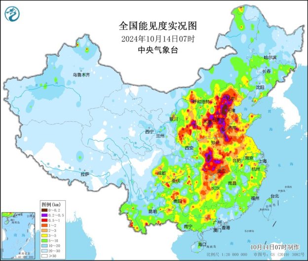 中新网10月14日电 据中央气象台网站消息,气象监测显示,14日早晨,我国华北、黄淮、江淮、江汉多地雾气弥漫,京津冀、山西、河南、山东、湖北等地部分地区能见度低于500米,局地出现不足200米的强浓雾。中央气象台14日早晨继续发布大雾黄色预警:预计上午时段,河北中南部、北京西部、山西中部、陕西北部、湖北中部等地的部分地区有能见度低于500米的浓雾,局地有不足200米的强浓雾。