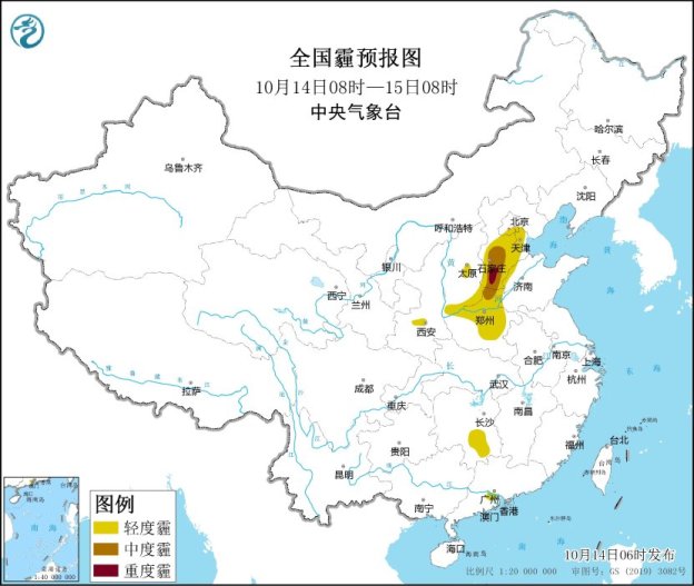 此外,今天白天,华北中南部、黄淮中西部、汾渭平原等地有轻至中度霾,北京南部、河北西部沿山部分地区有重度霾。建议上述地区公众户外活动做好防护措施,驾车出行需谨慎慢行,注意交通安全。