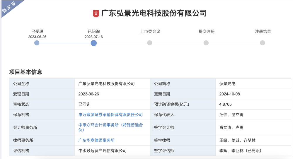 2023年6月26日,弘景光电向创业板递交了IPO申请,同年7月26日,收到第1轮审核问询函,截至上会前,弘景光电共经历2轮问询。弘景光电的保荐机构为申万宏源,拟募资4.8765亿元。