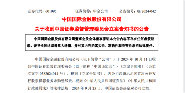 10月11日晚,国内头部券商中金公司(601995.SH)发布《关于收到中国证券监督管理委员会立案告知书的公告》。公告称,中金公司10月11日收到中国证监会《立案告知书》,因公司涉嫌思尔芯首次公开发行股票保荐业务未勤勉尽责,根据《证券法》《行政处罚法》等法律法规,2024年9月25日,中国证监会决定对公司立案。