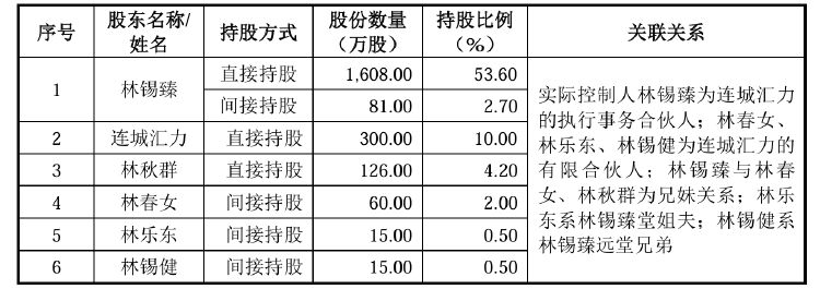 据渡远户外招股书,其董事长林锡臻直接持有公司53.60%的股份,并通过连城汇力控制公司10%的股份,合计控制公司63.60%的股份,为公司的控股股东和实际控制人。
