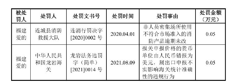 监管关注到,渡远户外子公司福建爱的存在两项行政处罚,包括非人员密集场所使用不符合市场准入的消防产品逾期未改,报关申报价格货币单位错误等。