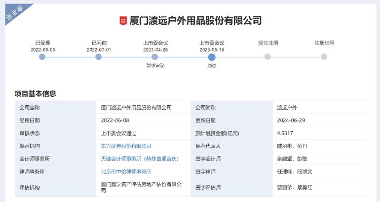 过会16个月后,厦门渡远户外用品股份有限公司创业板IPO仍未提交注册。