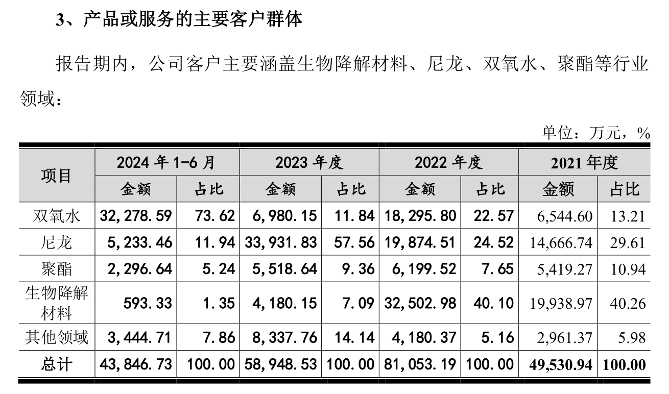 来源:注册稿与之对应的是,双氧水业务的收入崛起,2021年金额6544.6万元,占比还为13.21%;2022年金额1.83亿元,占比22.57%;2023年该业务又出现回落,金额6980.15万元,占比11.84%;2024年上半年金额3.23亿元,占比73.62%。