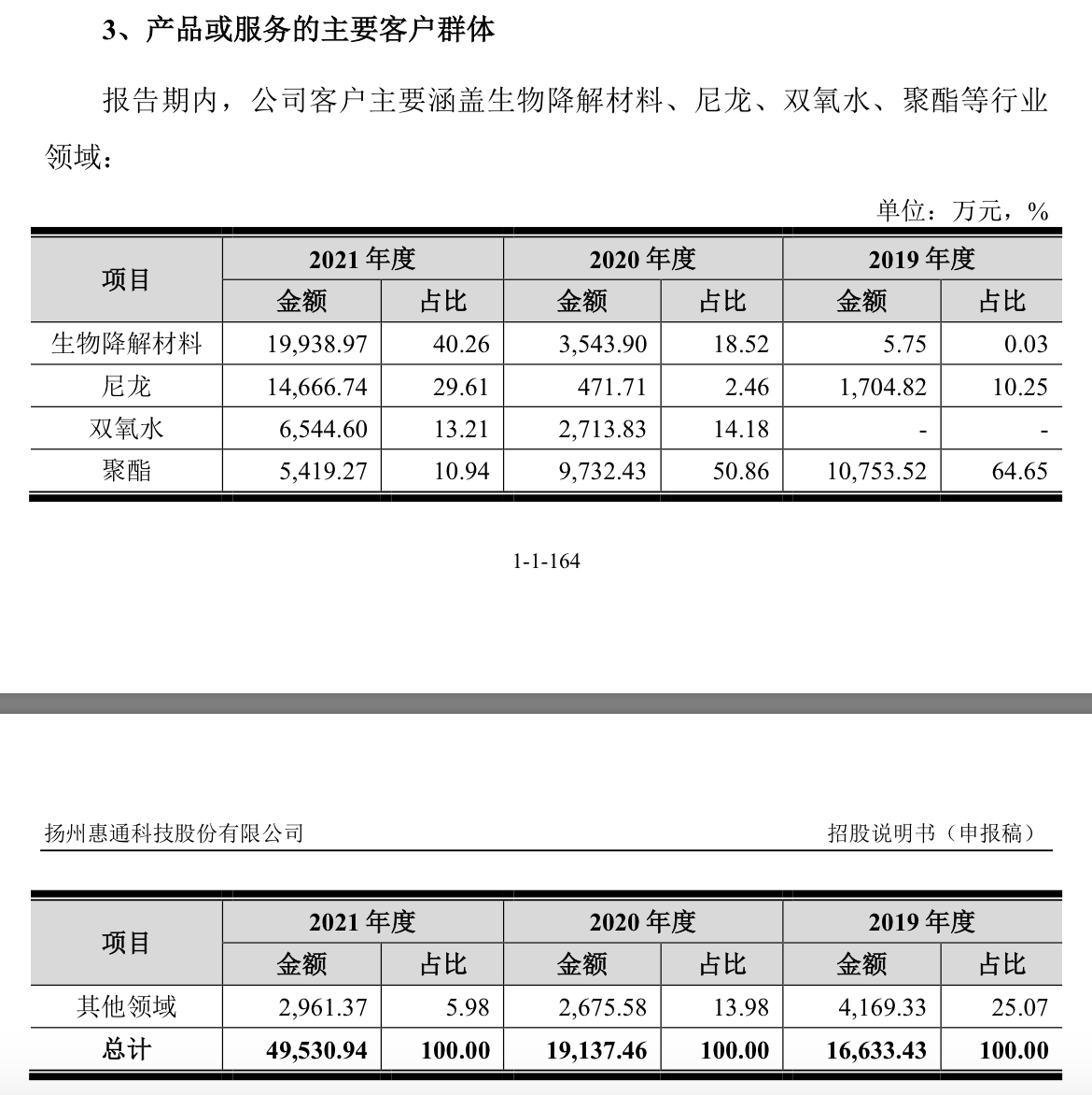 来源:申报稿根据2022年6月17日的申报稿,惠通科技2021年生物降解材料领域的收入仅2亿元,占比40.26%,这是从2019年的0.03%占比一路狂奔上来的。
