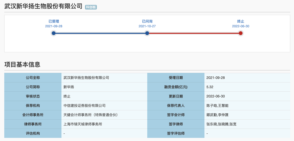 澎湃新闻记者通过多项信息比对发现,该案例指向武汉新华扬生物股份有限公司(简称“新华扬”)。新华扬发行人分别于2011年、2017年递交创业板上市申请,随后均主动撤回。2021年9月,新华扬向科创板IPO申请,2022年6月30日主动撤回IPO申请。