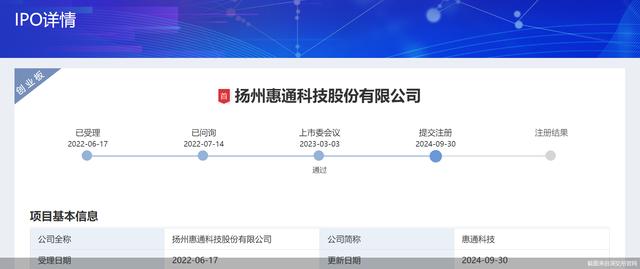 深交所官网显示,惠通科技创业板IPO于2022年6月17日获得受理,当年7月14日进入问询阶段,2023年3月3日上会获得通过,时隔一年半,于近期提交注册申请。