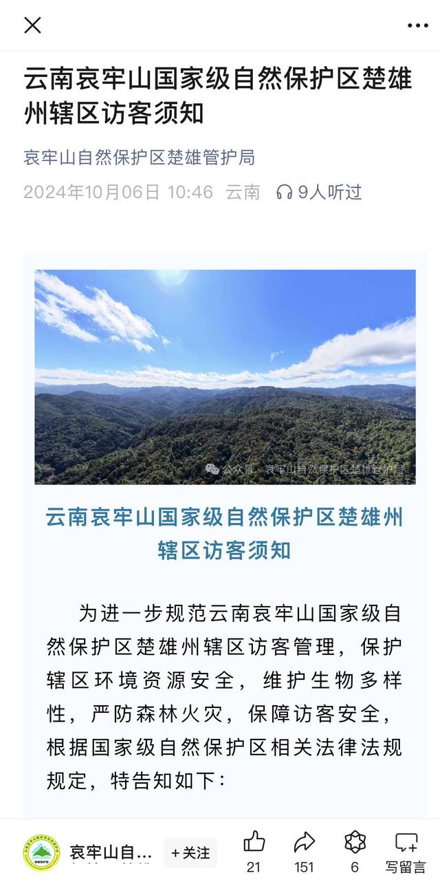 那么,进山采石应当经过怎样的报备审批流程?据哀牢山自然保护区楚雄管护局10月6日发布的《云南哀牢山国家级自然保护区楚雄州辖区访客须知》,以及《关于禁止进入自然保护区开展各类未经批准的人为活动的告知书》规定,禁止在云南哀牢山国家级自然保护区楚雄州辖区缓冲区开展旅游和生产经营活动。因教学科研的目的,需要进入缓冲区从事非破坏性的科学研究、教学实习和标本采集活动的,应当事先向楚雄管护局提交申请和活动计划,并经楚雄州林业和草原局批准。从事科研活动的单位和个人,应当将其科研成果的副本提交云南哀牢山国家级自然保护区楚雄管护局。