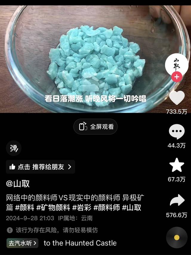 记者查询发现,账号“山取”由云南山取画材有限公司运营,是一家从事颜料制造和销售的企业,视频中的博主为山取公司颜料师张俊杰。在一段21分12秒的视频中,张俊杰拍摄视频记录前往哀牢山寻找异极矿碎矿。他穿过茂密的丛林和一片湖泊后,抵达柏拉木林子区域,捡拾了数十块蓝色的矿石带出山,并对矿石进行了打碎、清洗、烘干等一系列处理。