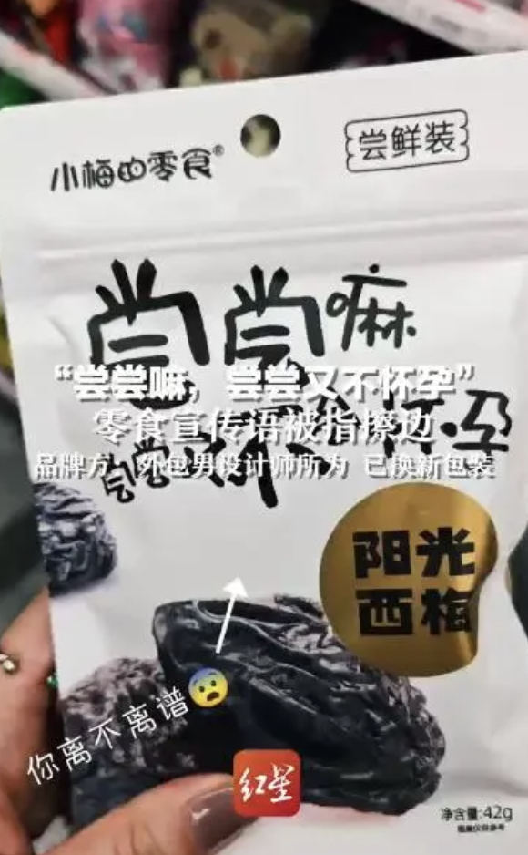 近日,部分网友发帖反映在超市里看到一款西梅零食,包装袋上印有恶俗宣传语“尝尝嘛,尝尝又不怀孕”,网友认为看得人生理不适。