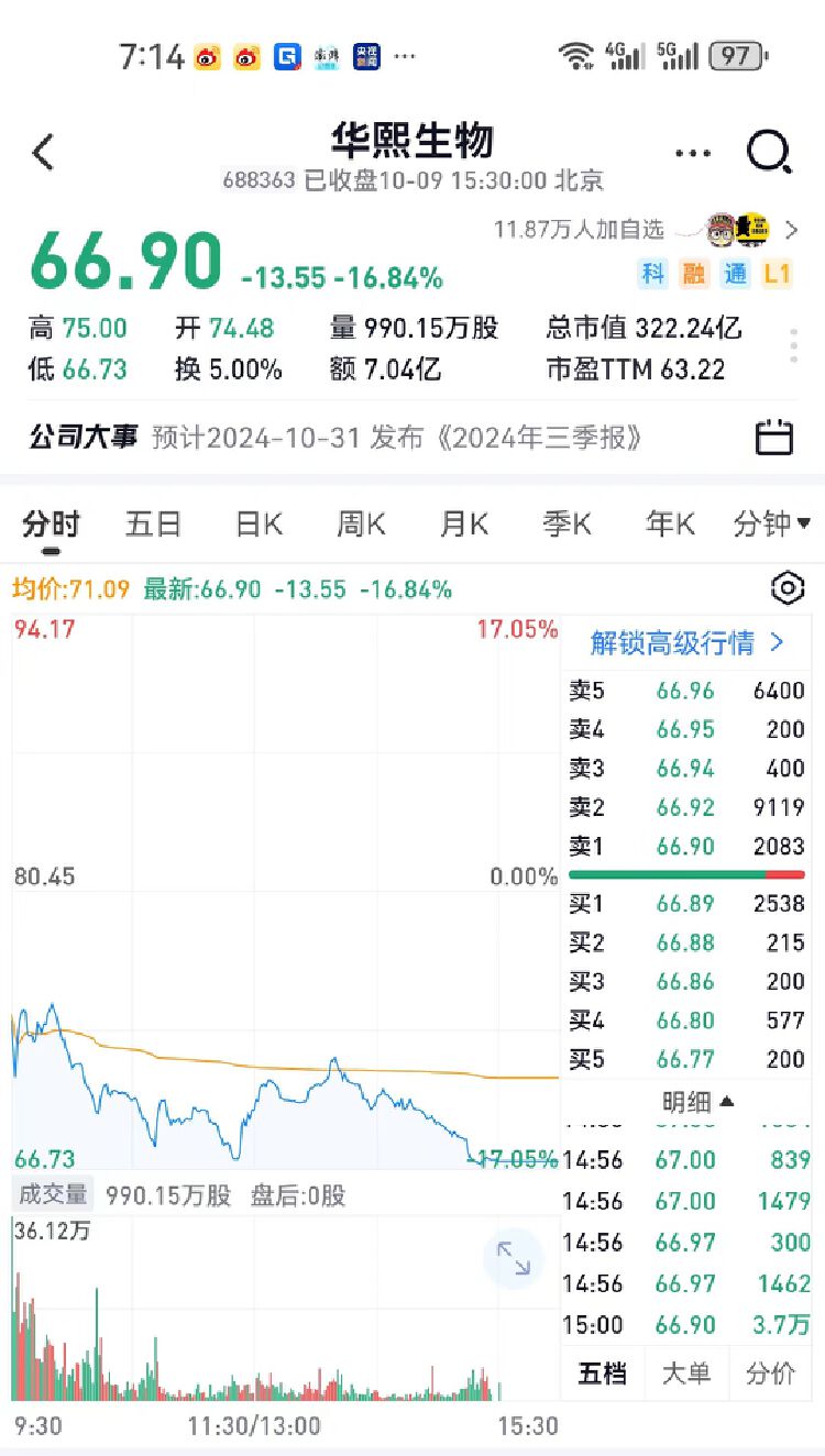 10月9日开盘后,医美龙头华熙生物(688363)股价走弱。截至收盘时,该公司收跌16.84%,股价为66.90元,总市值为322.24亿元。