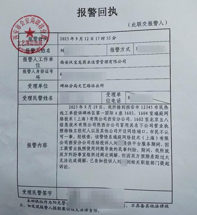 据悉,该诈骗团伙集中于2023年3月左右,涉嫌通过“高入低出”“长收短付”的模式套取租金,随后借口公司“停业整顿”人去楼空,涉案金额疑似超百万元。此案由西安市公安局高新分局侦办。该案相关受害者李先生在接受采访时表示,自己曾因租借的“西安汉宝龙商业运营管理有限公司”出租房屋存在消防安全隐患,向西安市高新区信访局投诉,该举报转交至高新区住建局后,原“西安汉宝龙商业运营管理有限公司”,现西安宝龙公司法人刘先生被要求整改,双方由此建立联系。