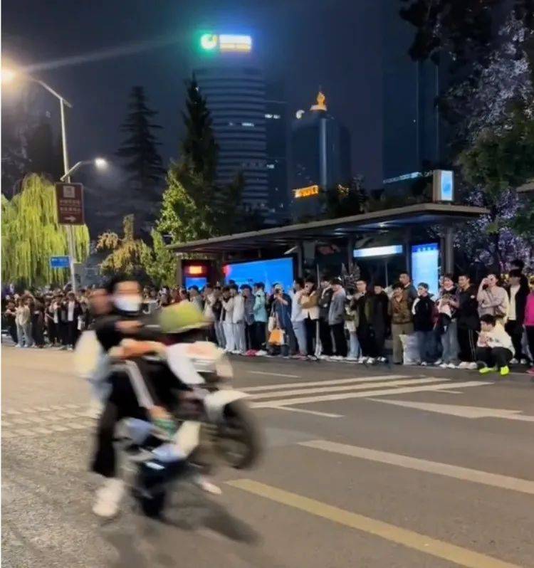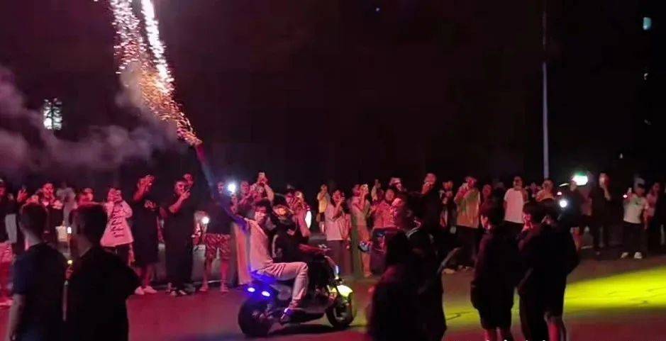 视频显示,有人戴上面具,有人手持“加特林”烟花;有人爬上公交站顶棚,狂欢跳舞;还有人骑着电动车“翘头”“飙车炫技”,把道路变成竞技场。有人因为速度过快,来不及刹车,追尾后摔倒在地。轰鸣声、呐喊声、音乐声不断,引来不少市民围观。