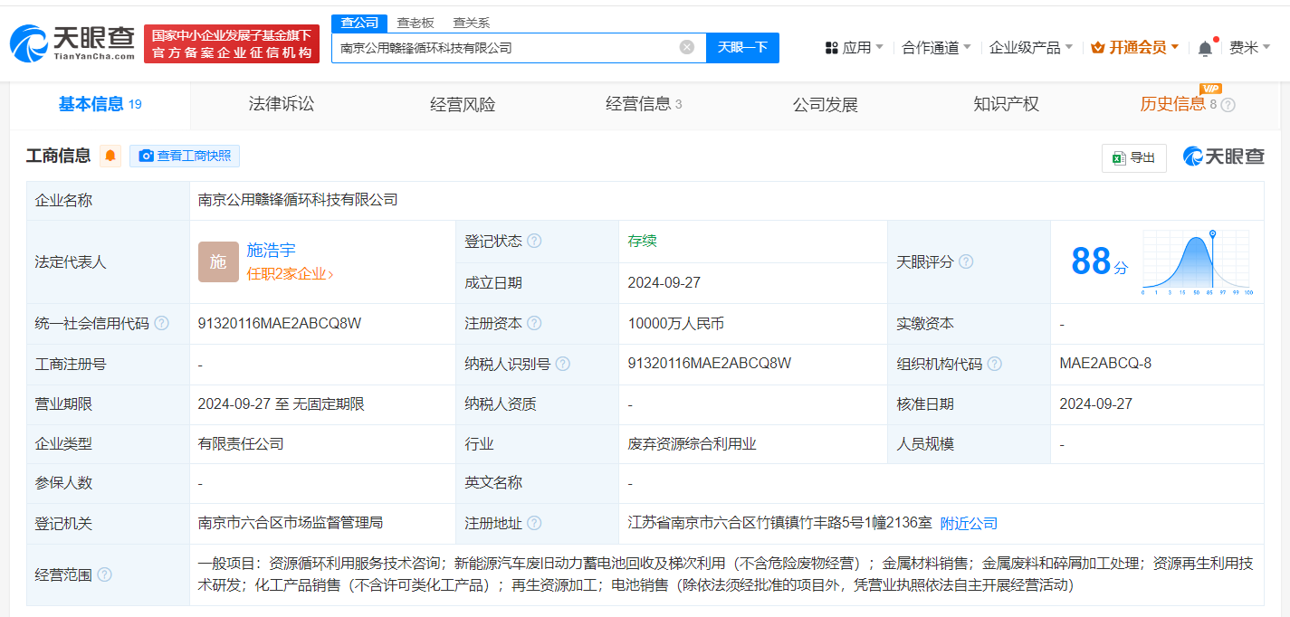 天眼查App显示,近日,南京公用赣锋循环科技有限公司成立,法定代表人为施浩宇,注册资本1亿人民币,经营范围含资源循环利用服务技术咨询、金属材料销售、金属废料和碎屑加工处理、资源再生利用技术研发、化工产品销售、再生资源加工等。股东信息显示,该公司由赣锋锂业(002460)旗下江苏赣锋循环科技有限公司、南京公用(000421)、南京环境集团有限公司共同持股。