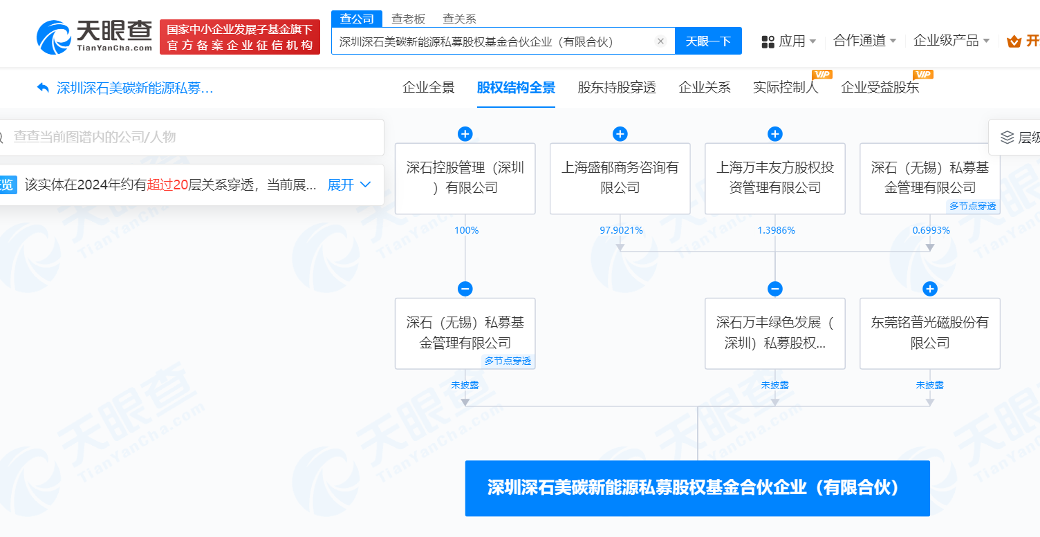 天眼查App显示,近日,深圳深石美碳新能源私募股权基金合伙企业(有限合伙)成立,执行事务合伙人为深石(无锡)私募基金管理有限公司,出资额2000万人民币,经营范围为以私募基金从事股权投资、投资管理、资产管理等活动。合伙人信息显示,该基金由深石资本旗下深石(无锡)私募基金管理有限公司、深石万丰绿色发展(深圳)私募股权投资基金合伙企业(有限合伙)以及铭普光磁(002902)共同出资。