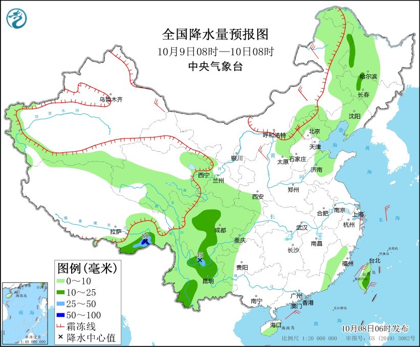 10月9日08时至10日08时,甘肃中部和南部、陕西南部、内蒙古中部偏南地区和东部、黑龙江中西部、吉林中西部、辽宁、河北北部、山西北部、山东中北部、四川、云南、贵州西部、台湾岛等地有小到中雨,其中,四川西南部、西藏东南部等地的部分地区有大雨,局地暴雨(50~80毫米);西藏东部、青海中南部和东部有小到中雪或雨夹雪。新疆东部、内蒙古中东部、陕西北部、山西北部、河北北部、浙江东部等地的部分地区有4~6级风(见图2);渤海、台湾海峡有5~7级、阵风8级的东北风。