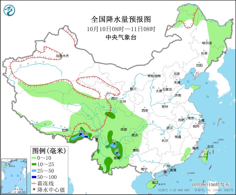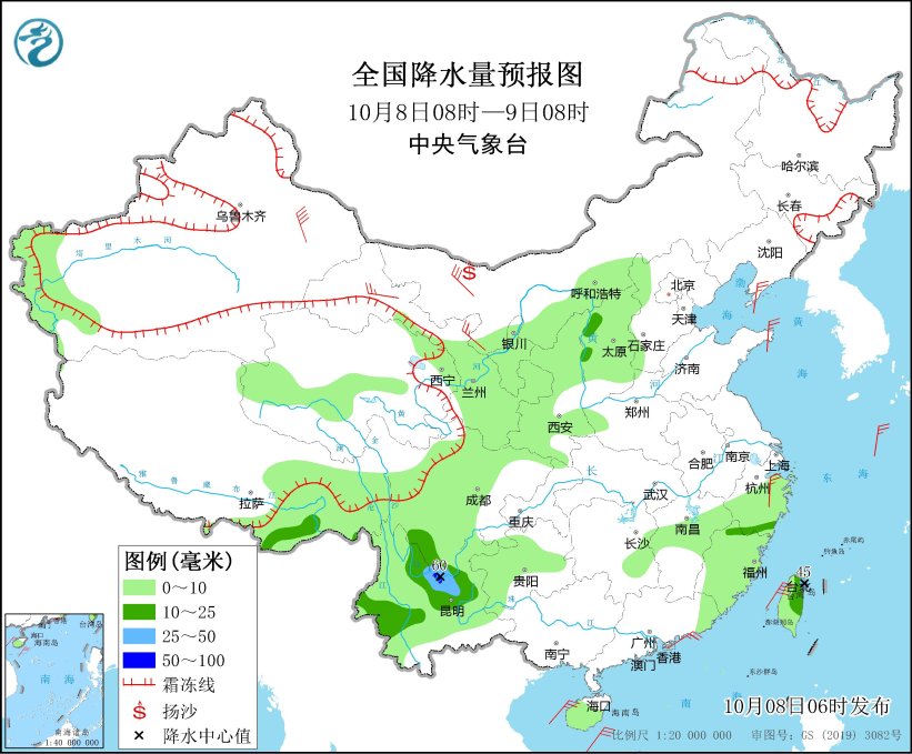 10月8日08时至9日08时,甘肃南部、陕西、内蒙古中部偏南地区、山西、四川中部和西部、云南、贵州中西部、江南东部、海南岛、台湾岛等地有小到中雨,其中,四川西南部、云南中北部等地的部分地区有大雨,局地暴雨(50~60毫米);新疆西南部山区、西藏东北部、青海西南部等地的部分地区有小到中雪或雨夹雪。新疆东部、甘肃中西部、内蒙古中西部、辽东半岛、山东半岛、浙江中东部等地的部分地区有4~6级风(见图1);东海南部、台湾海峡有5~7级、阵风8级的东北风。