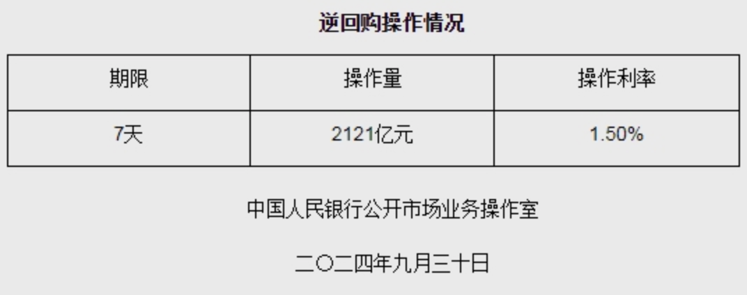 为维护季末银行体系流动性合理充裕,2024年9月30日人民银行以固定利率、数量招标方式开展了2121亿元逆回购操作。具体情况如下: