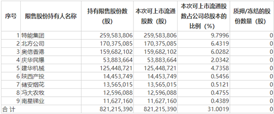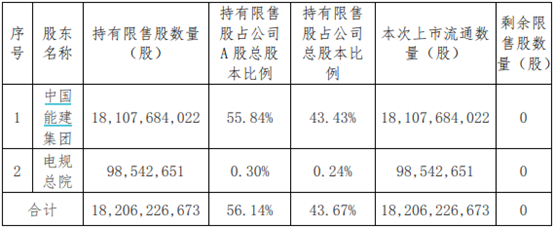 根据公告,中国能建9月30日有182.06亿股限售股上市流通,占总股本比例的43.67%,约合解禁市值407.82亿元。
