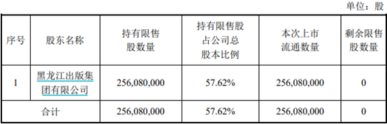 中国能建本次限售股解禁明细龙版传媒本周有上市三年期首发限售股上市流通,解禁数量2.56亿股,占总股本比例57.62%,解禁市值35.90亿元。解禁股东只有一位——黑龙江出版集团有限公司,因此解禁压力也小。