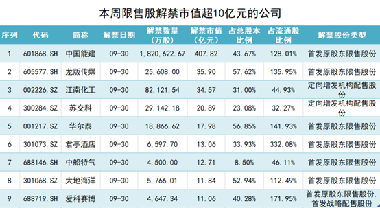 本周解禁市值超过10亿元的公司有9家,中国能建(601868.SH)一家独大,解禁市值超过400亿元,龙版传媒(605577.SH)、江南化工(002226.SZ)紧随其后,解禁规模超过30亿元。