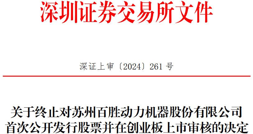 深交所网站9月26日披露关于终止对苏州百胜动力机器股份有限公司(简称“百胜动力”)首次公开发行股票并在创业板上市审核的决定。