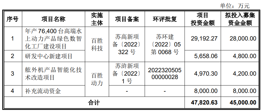 百胜动力原拟在深交所创业板发行不超过2,843.50万股,占发行后公司总股本的比例不低于25%,公司现有股东在本次发行中不转让老股。公司原拟募集资金45,000.00万元,用于年产76,400台高端水上动力产品绿色数智化工厂建设项目、研发中心新建项目、舷外机产品智能化技术改造项目、补充流动资金。