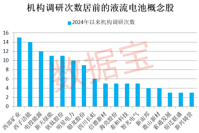 今年以来,多只液流电池概念股持续受到机构关注。据数据宝统计,逾八成概念股年内获得机构调研,其中西部矿业、西子洁能、电投能源、新天绿能、钒钛股份、明星电力获机构调研10次以上。