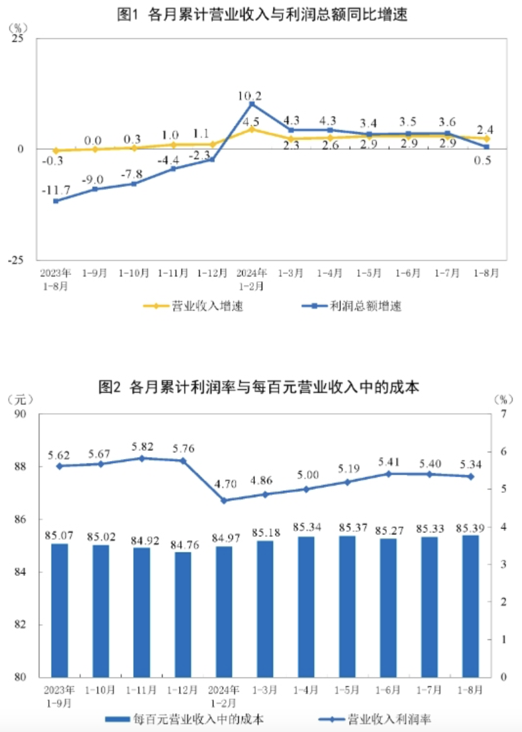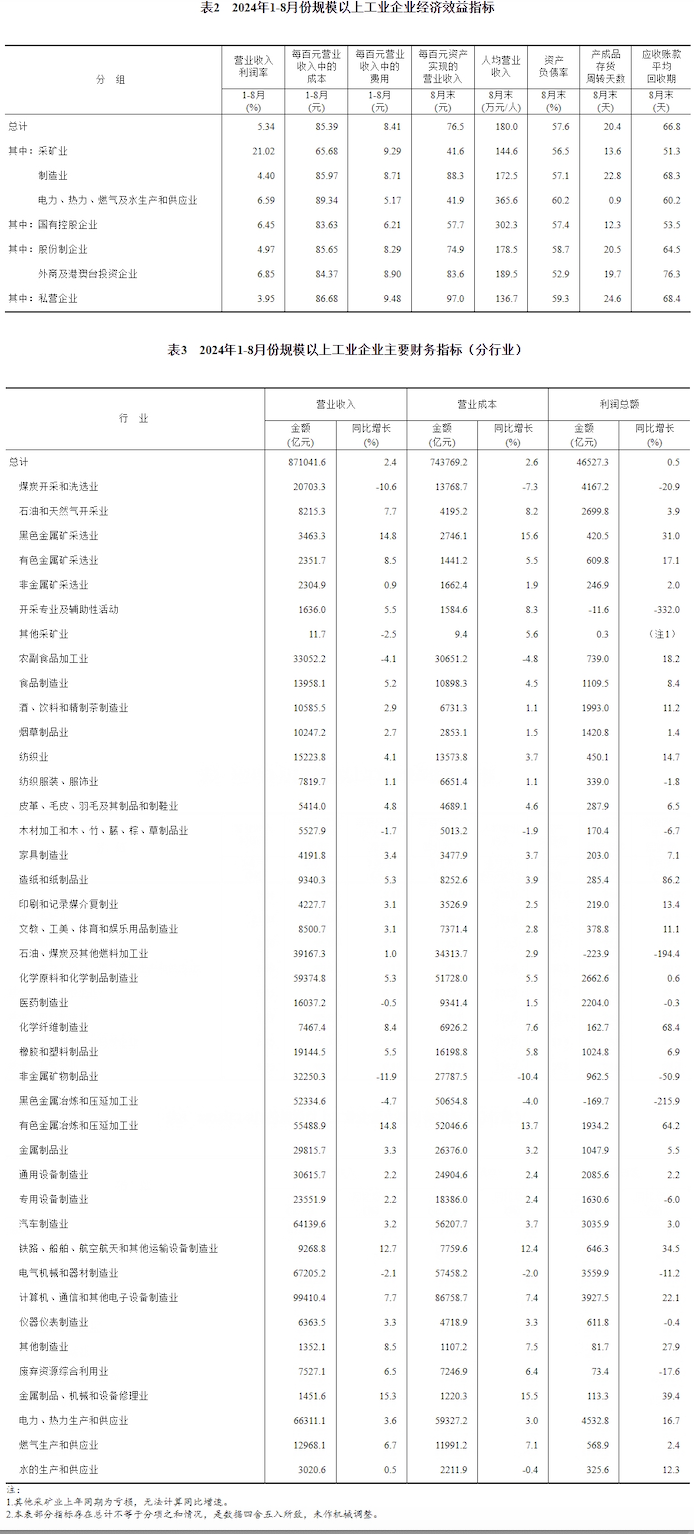1—8月份,规模以上工业企业实现营业收入87.10万亿元,同比增长2.4%;发生营业成本74.38万亿元,增长2.6%;营业收入利润率为5.34%,同比下降0.10个百分点。