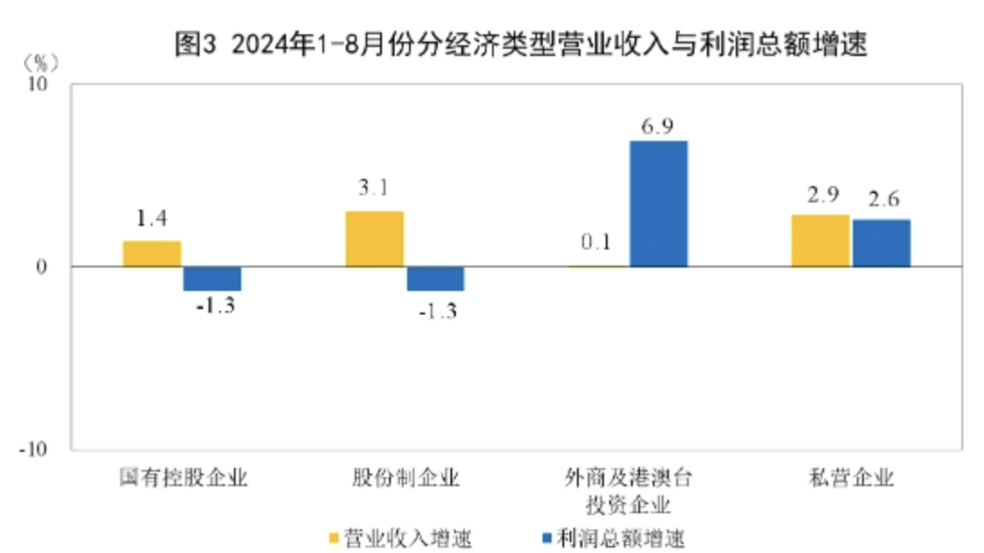 1—8月份,规模以上工业企业中,国有控股企业实现利润总额15490.6亿元,同比下降1.3%;股份制企业实现利润总额34430.3亿元,下降1.3%;外商及港澳台投资企业实现利润总额11777.0亿元,增长6.9%;私营企业实现利润总额12648.3亿元,增长2.6%。