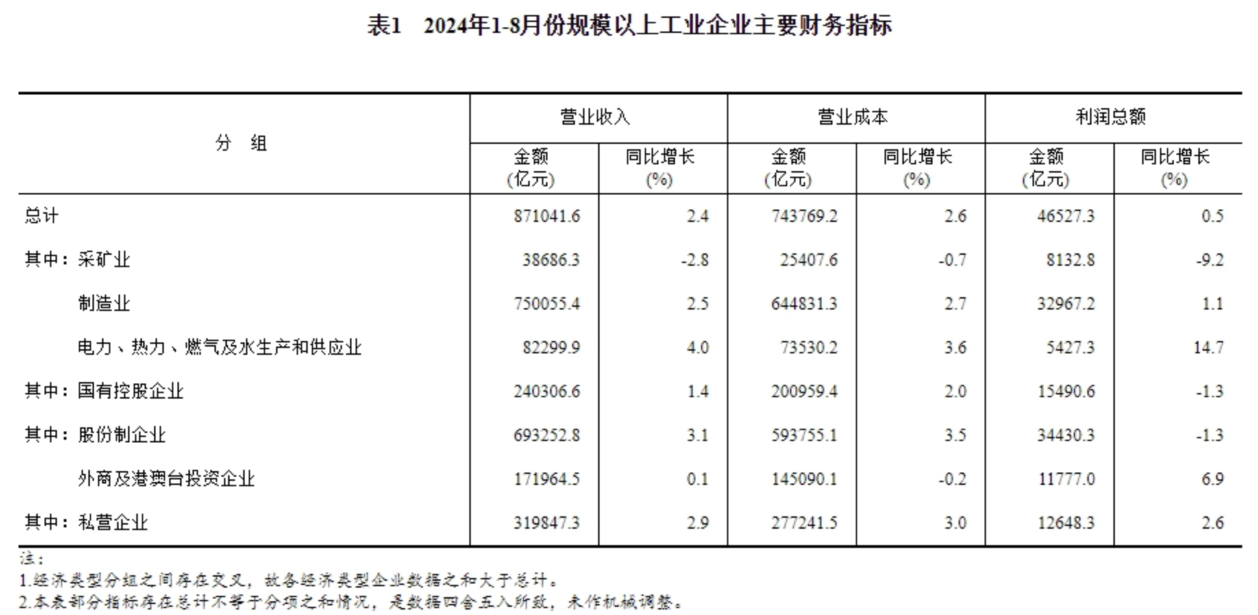 1—8月份,全国规模以上工业企业实现利润总额46527.3亿元,同比增长0.5%。