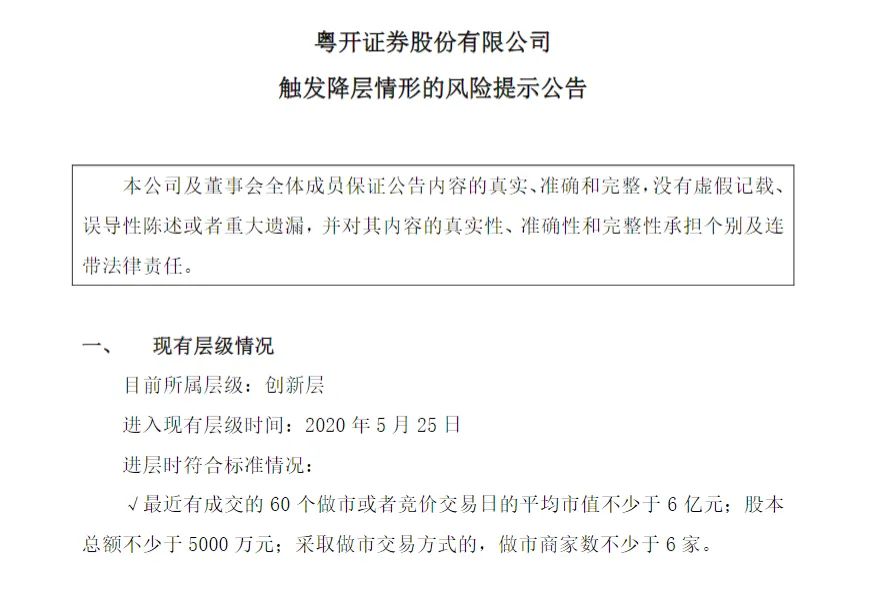 公告还显示,根据《分层管理办法》第二十一条的相关规定,粤开证券存在自调整至基础层之日起12个月内不得再次进入创新层的风险。