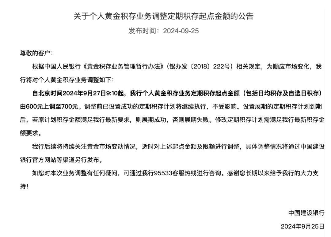 9月25日,建设银行发布公告称,自北京时间2024年9月27日9:10起,建设银行个人黄金积存业务定期积存起点金额(包括日均积存及自选日积存)由600元上调至700元。调整前已设置成功的定期积存计划将继续执行,不受影响。设置展期的定期积存计划到期后,若原计划积存金额满足最新要求,则展期成功,否则展期失败。