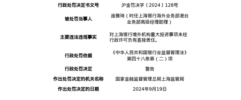 9月19日,国家金融监督管理总局上海监管局发布了一则行政处罚决定书(沪金罚决字〔2024〕128号),对上海银行(601229)海外业务部港台业务部高级经理助理庞雅琦进行处罚。