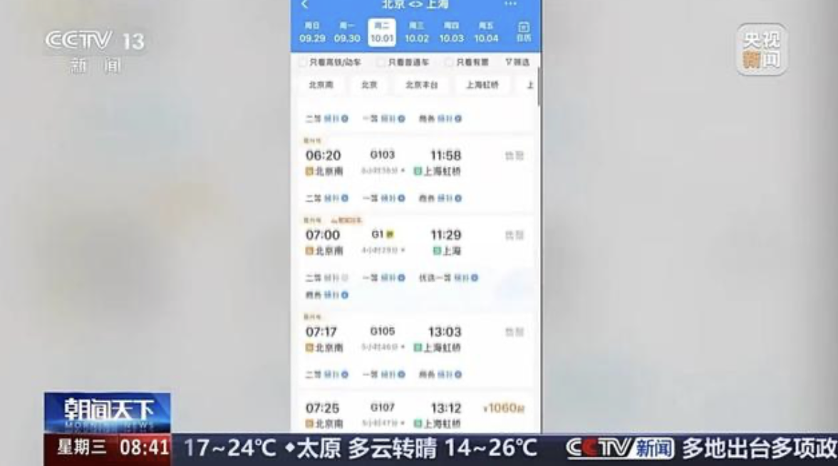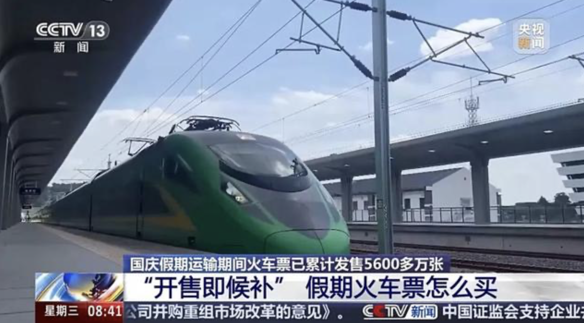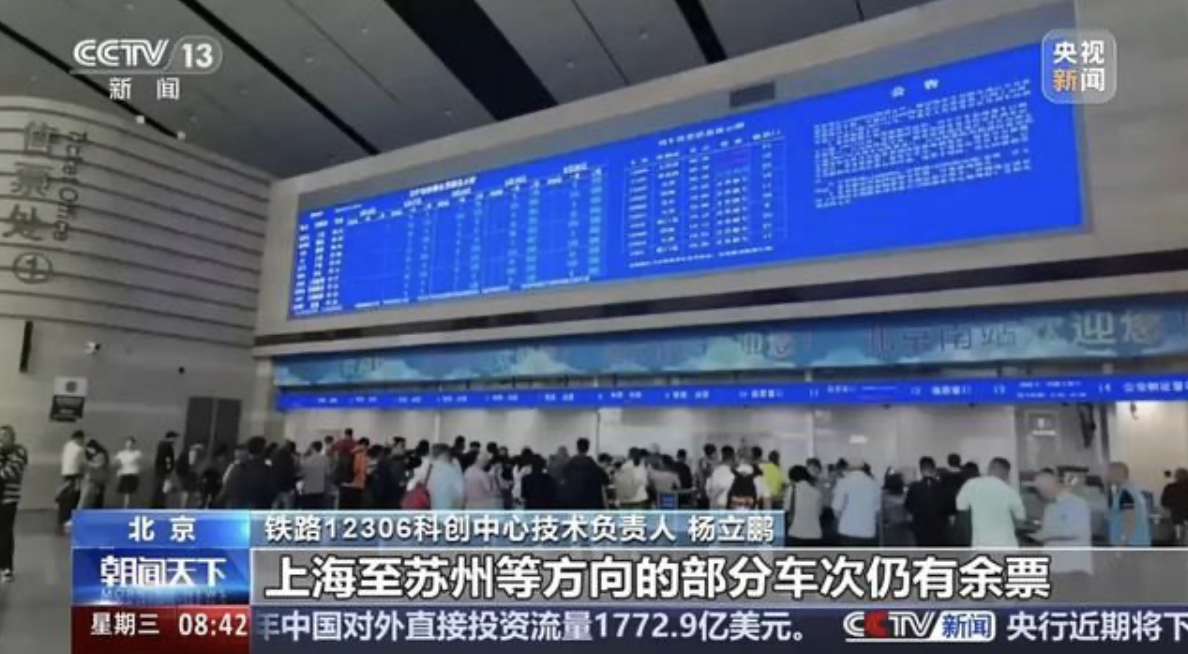 铁路12306科创中心技术负责人 杨立鹏:9月29日至10月1日节前出行高峰时段,北京至天津往返、苏州至上海、南京至上海、深圳至香港往返、保定至北京、南宁至广州、上海至苏州等方向的部分车次仍有余票;10月6日至7日节后返程高峰时段,上海至南京往返、深圳至香港往返、广州至南宁、北京至上海、上海至苏州、成都至重庆等方向的部分车次仍有余票。