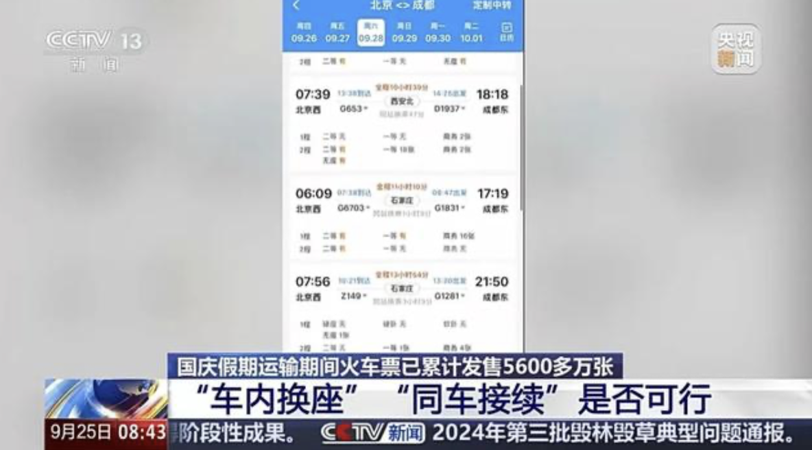 记者登录12306网站,查询9月28日从北京到成都的火车票,点击“中转”标签,系统提供了不同车次的换乘方案,其中有同站换乘、同城换乘,还新增了一种“车内换座”。这种新的售票方式,是将能组合的同一列车不同区段的两段同席别或不同席别的剩余车票,组合形成该车次的同车接续方案,供旅客选择。