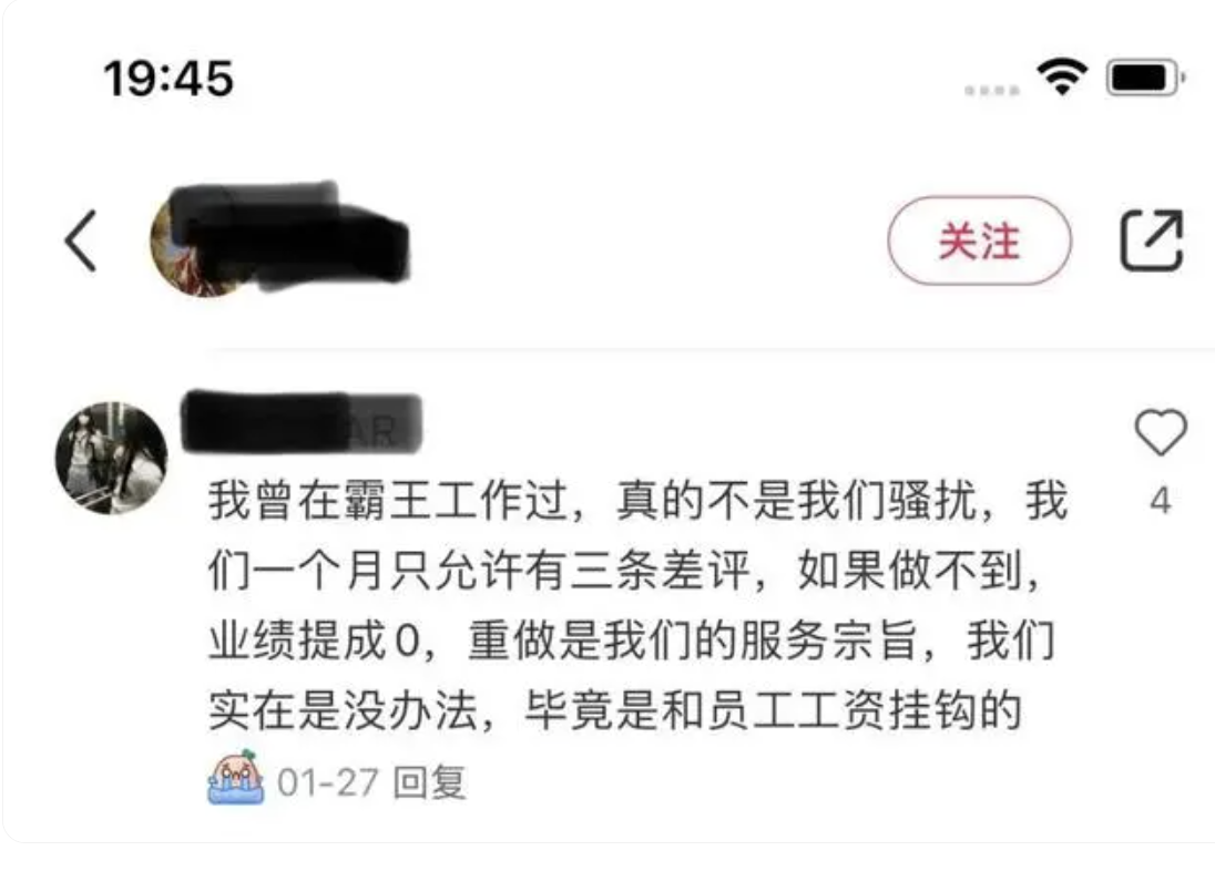 而在社交平台上,有多名用户分享自己在给霸王茶姬门店差评后被打电话请求删评的经历。而有自称霸王茶姬前店员的网友则声称,店员并不想骚扰顾客,而是差评数量与业绩和工资挂钩,差评超过一定数量,会被扣钱。