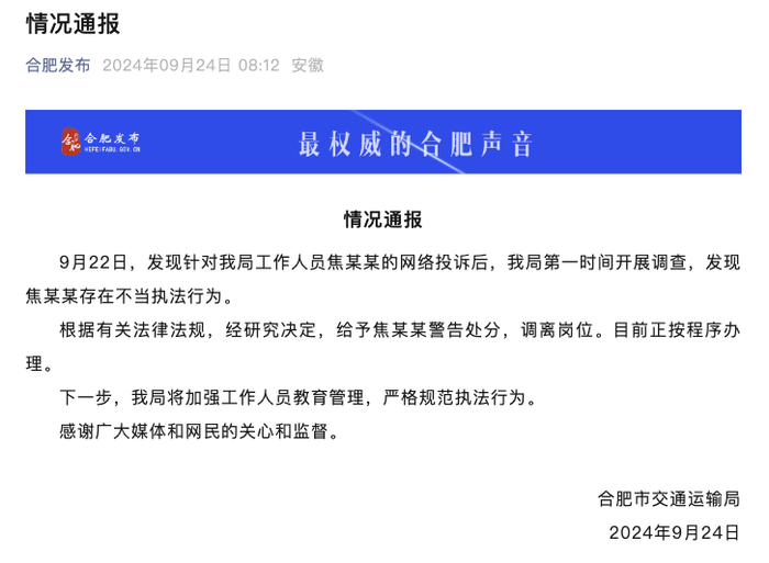 近日,有网约车司机在网上反映称,一名合肥市交通运输局的工作人员乘坐其车辆,在到达目的地快下车时“亮证”后要求检查其网约车“两证”。该名司机质疑对方身着便装和单人执法,并拒绝配合,之后其在网约车平台的账号被封禁。合肥市交通运输局9月24日通报,9月22日,发现针对交通运输局工作人员焦某某的网络投诉后,交通运输局第一时间开展调查,发现焦某某存在不当执法行为。根据有关法律法规,经研究决定,给予焦某某警告处分,调离岗位。目前正按程序办理。