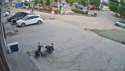 监控视频显示,事发时间为9月11日上午9时19分,一辆蓝色电动汽车飞速行驶,撞向路旁花坛后,车身失控被甩出,再次撞到停在路旁的白车。白色司机下车后,见蓝色电动汽车燃起明火,立即驾驶白车远离现场,随后下车折返。