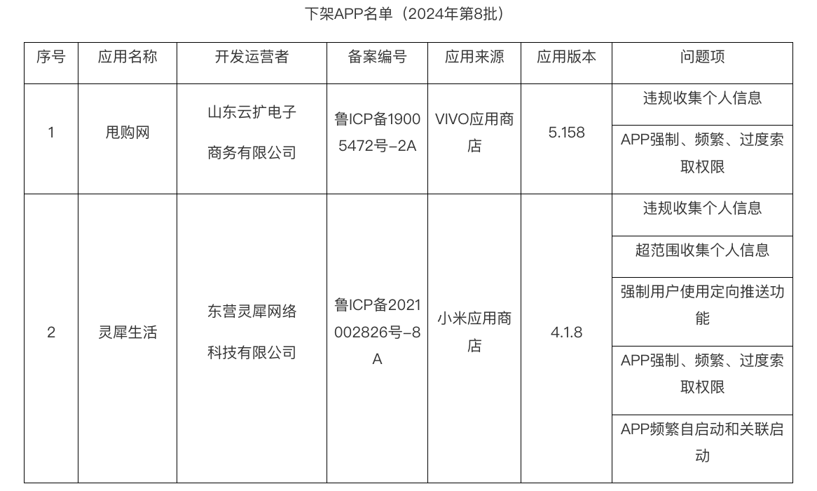 通报显示,甩购网的问题项为违规收集个人信息、APP强制、频繁、过度索取权限。灵犀生活的问题项为违规收集个人信息、超范围收集个人信息、强制用户使用定向推送功能、APP强制、频繁、过度索取权限、APP频繁自启动和关联启动。应用来源分别为VIVO应用商店以及小米应用商店。