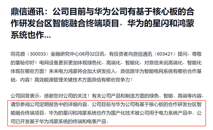 8月2日该公司再度披露,正与华为紧密合作,共同研发基于核心板的台区智能融合终端项目。此外,鼎信通讯还将华为的星闪和鸿蒙系统作为国产化技术的重要组成部分,应用于电力系统产品中。鼎信通讯已经开发出基于华为鸿蒙系统的终端和电表产品。