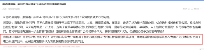 7月22日公司在互动易回复:公司目前与华为公司有基于核心板的合作研发台区智能融合终端项目,华为的星闪和鸿蒙系统也作为国产化技术被公司用于电力系统产品中。公司已开发基于华为鸿蒙系统的终端和电表产品。