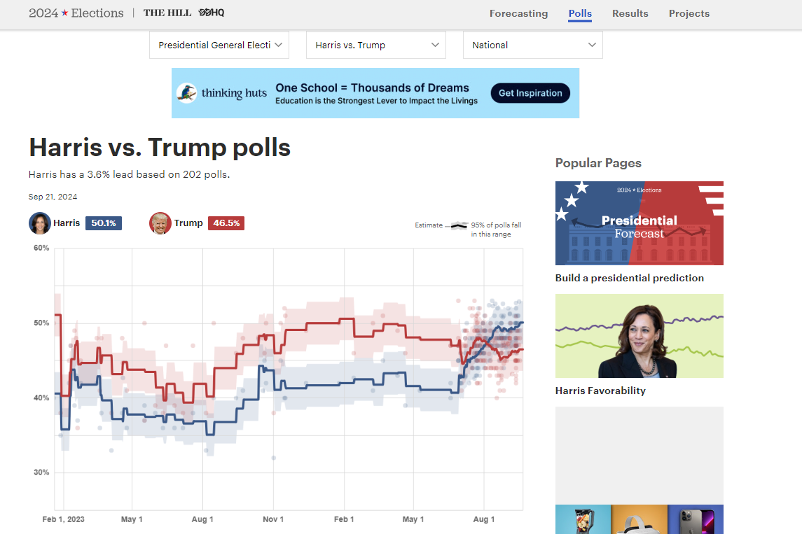在《国会山报》(the Hill)/美国选举预测机构决策台总部(DECISION DESK HQ,以下简称DDHQ)跟踪的202份民意调查中,哈里斯仅领先特朗普3.6%。而且以史为鉴,在2016年的总统竞选中,尽管筹集的资金少于民主党人希拉里·克林顿,但特朗普还是击败了她。