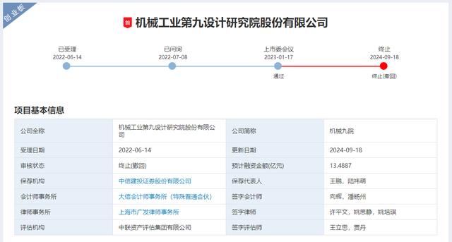 央广网北京9月19日消息 据深交所,9月18日,机械工业第九设计研究院股份有限公司(下称“机械九院”)创业板IPO注册被正式终止。披露显示,因机械九院和保荐人中信建投撤回发行上市申请,深交所决定终止其公开发行股票并在创业板上市注册程序,此时距2023年1月17日深交所上市委会议通过机械九院IPO申请已过去20个月。