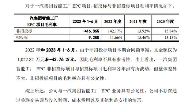 机械九院表示,智能工厂EPC项目一般属于客户的大额固定资产投资类项目,不同项目的投资构成、技术难度、项目规模、客户等不尽相同,具有非标准化特征,难以取得标准的市场公允价格或第三方市场价格。报告期内,公司主要通过招投标形式获取一汽集团智能工厂EPC项目,在一汽集团智能工厂EPC项目中报价与其他竞争对手较为接近,公司通过招投标获取的智能工厂EPC项目关联交易价格具有公允性。一汽集团智能工厂EPC非招投标项目与招投标项目毛利率各年虽有所波动,但整体差异不大,非招投标项目的毛利率亦具有公允性。因此,公司与一汽集团智能工厂EPC业务具有公允性,公司不存在通过关联交易调节收入利润、成本费用以及其他利益安排的情形。